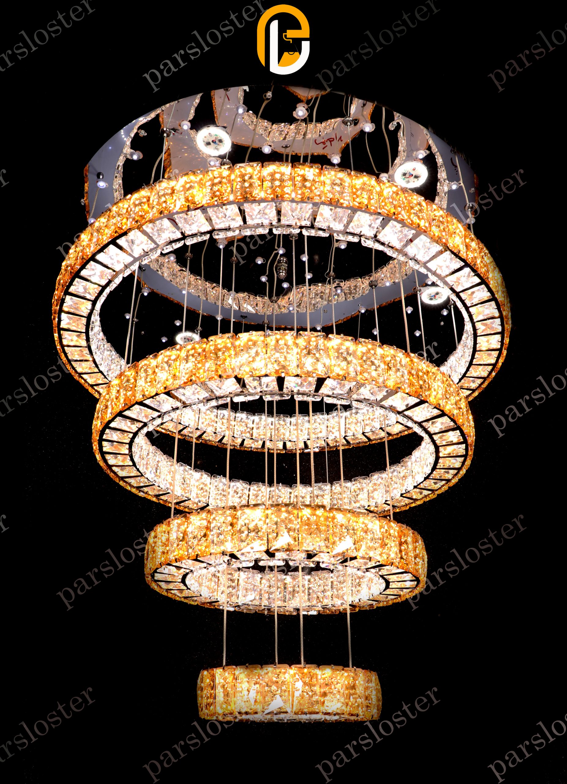 لوستر کریستالی مدرن چند حلقهای – تولیدی پارس لوستر این لوستر کریستالی شیک و مدرن با طراحی چند حلقهای، جلوهای لوکس و چشمگیر به هر فضا میبخشد. استفاده از کریستالهای باکیفیت و نورپردازی ترکیبی زرد و سفید، باعث میشود این لوستر علاوه بر روشنایی، بهعنوان یک المان دکوراتیو خاص در منزل یا محل کار بدرخشد. لوستر چند طبقه پارس لوستر انتخابی ایدهآل برای سالن پذیرایی، لابی هتلها، ویلاها و فضاهای لوکس است. نصب آسان، کیفیت بالا و طراحی منحصربهفرد از ویژگیهای اصلی این محصول میباشد.